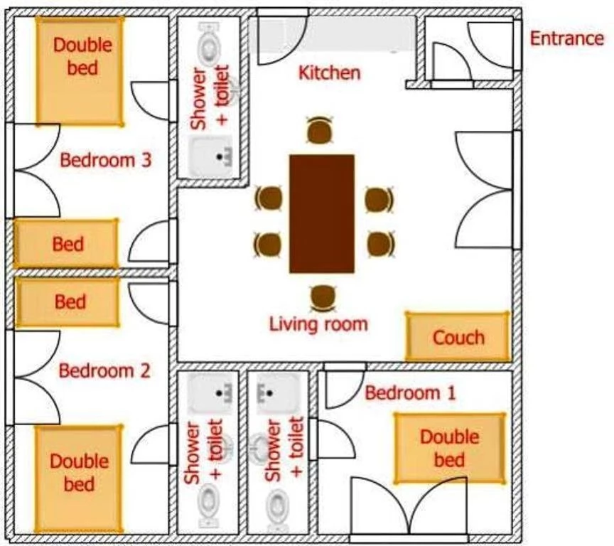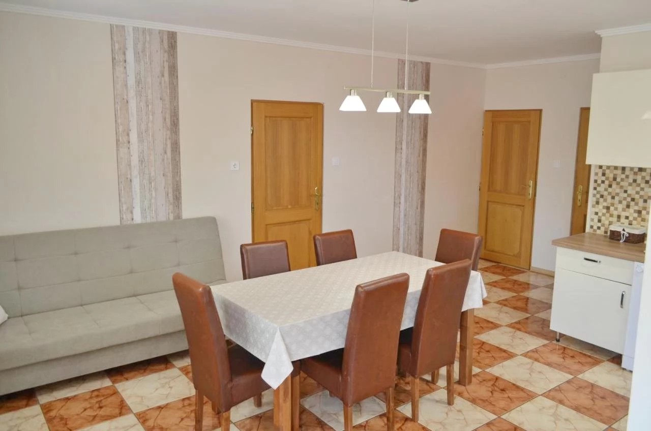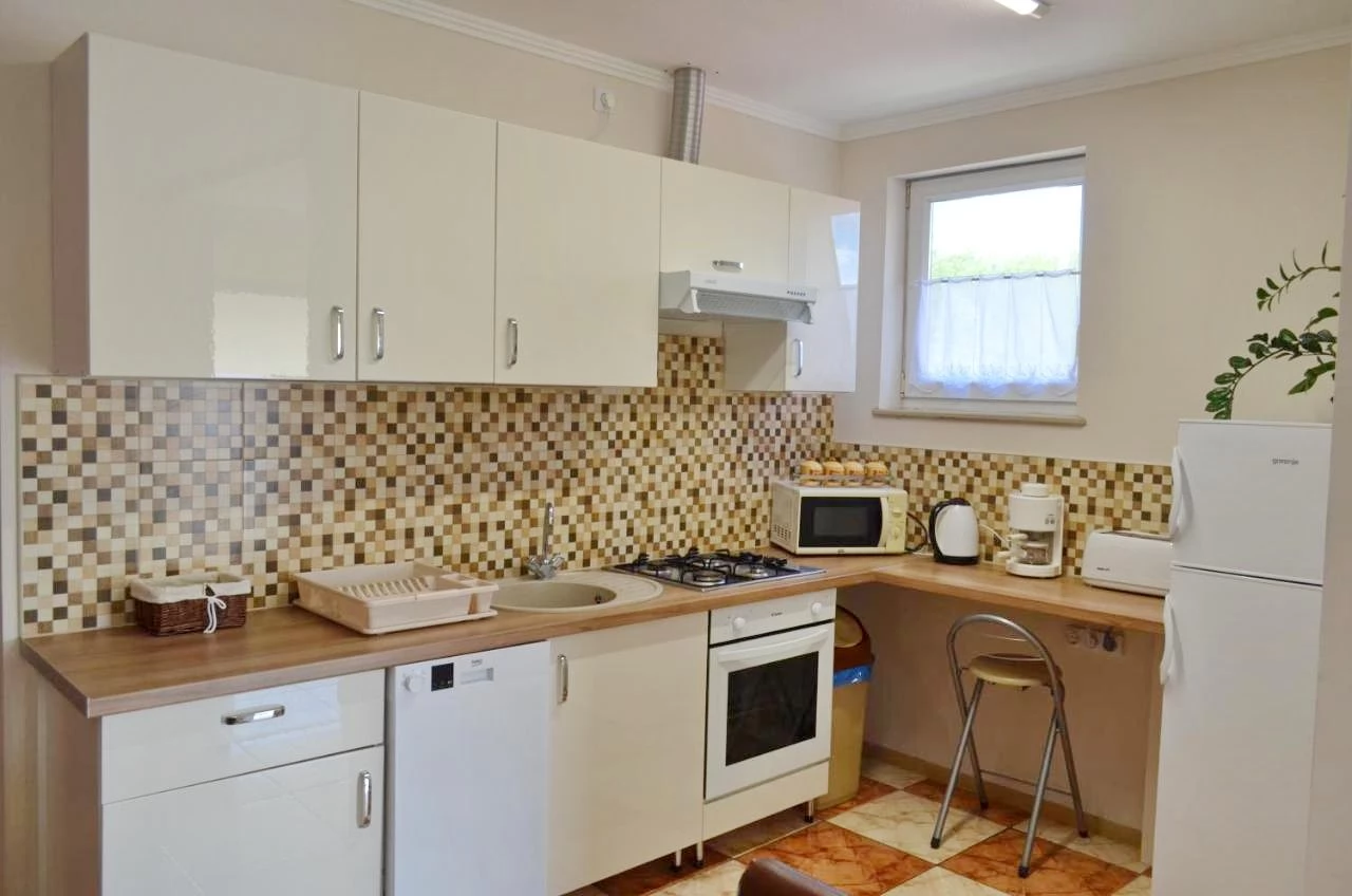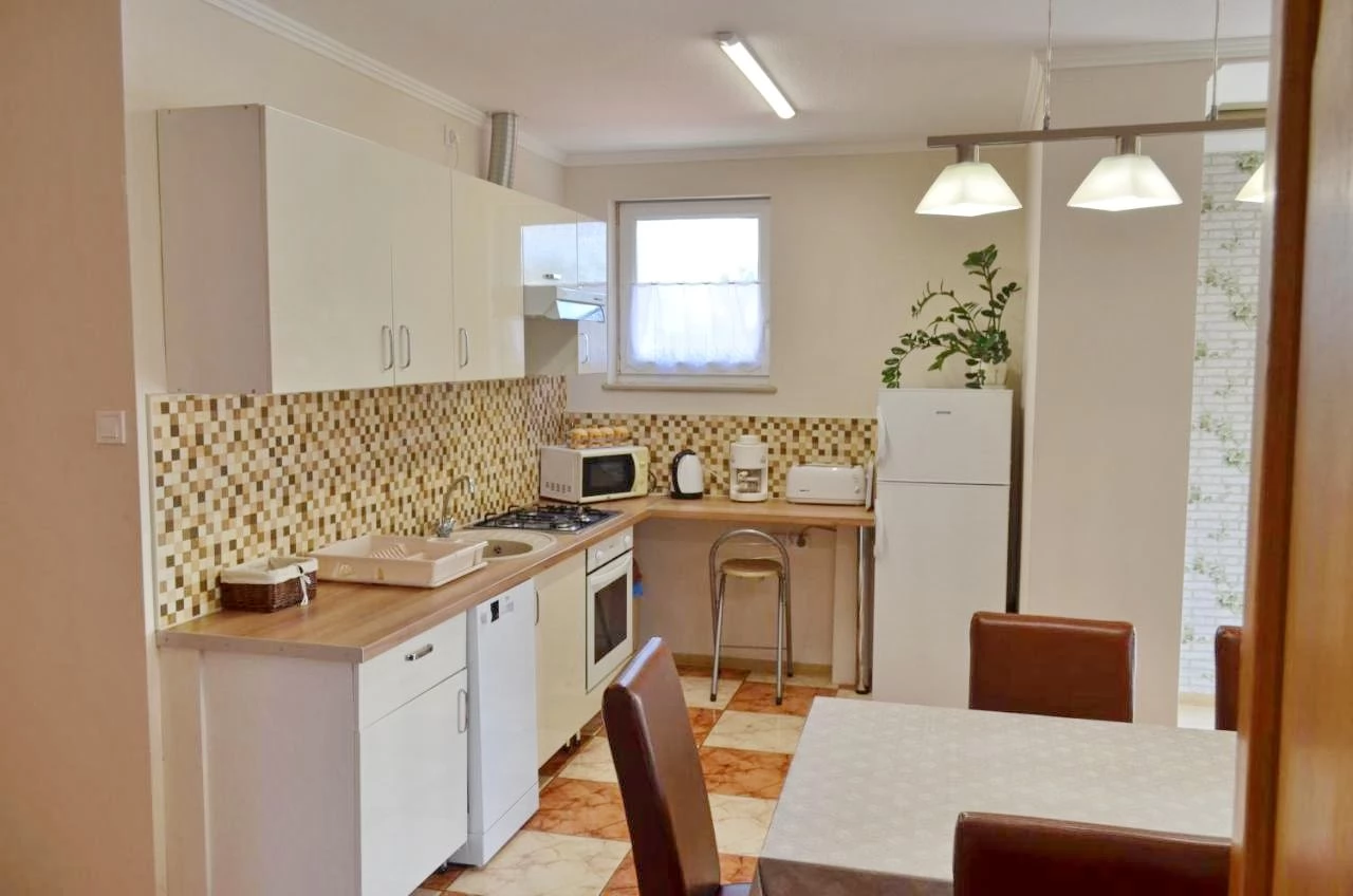 Az apartmanházban két különálló szinten 6 db 2-3 ágyas szoba található. Szintenként jól felszerelt konyha és étkező található (gáztűzhely, mikrohullám sütő, kávéfőző, teljes konyhai- és evőeszközök).