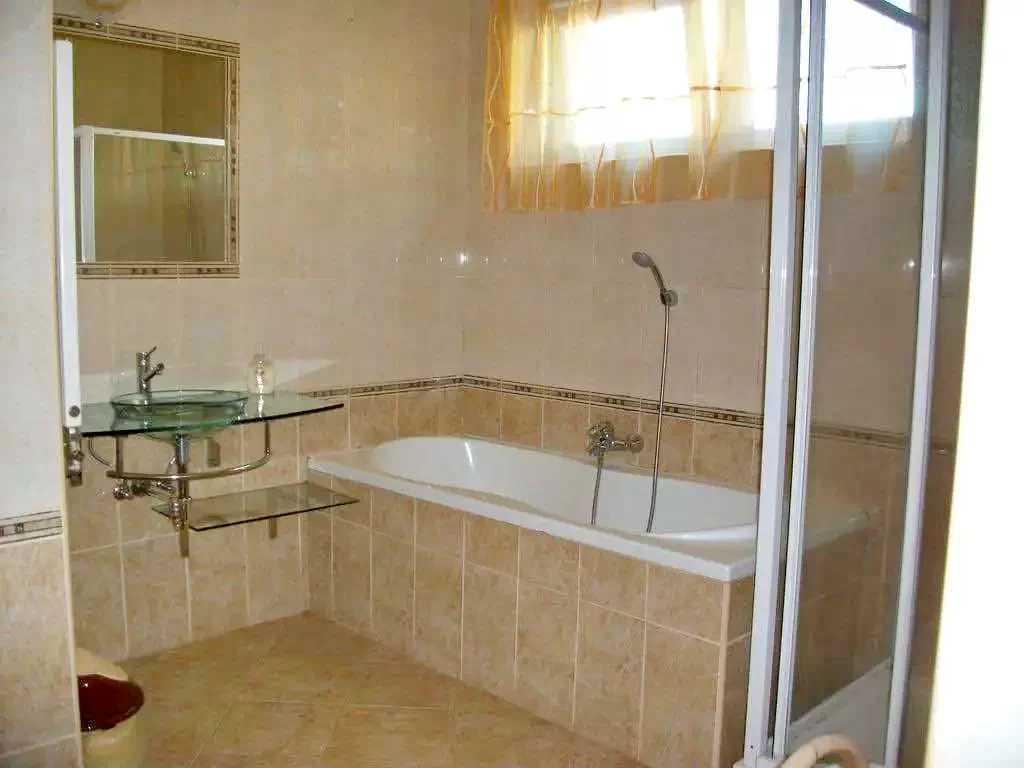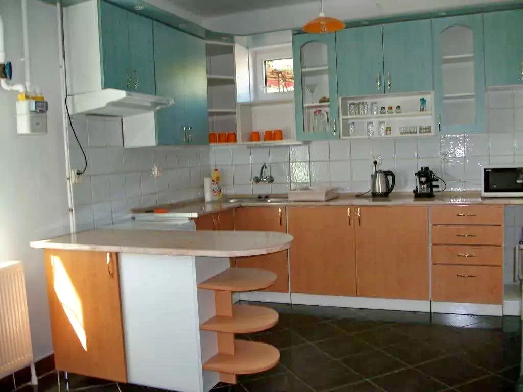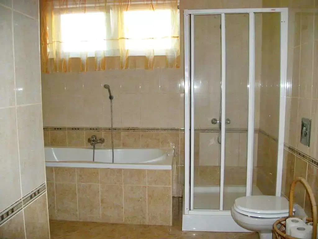 Az alsó szinten van egy 4 fős klímás, teljesen külön álló apartman, külön bejárattal,tágas fürdőszobával, kis előtérrel, ahol kilehet ülni. A konyhája teljesen felszerelt.