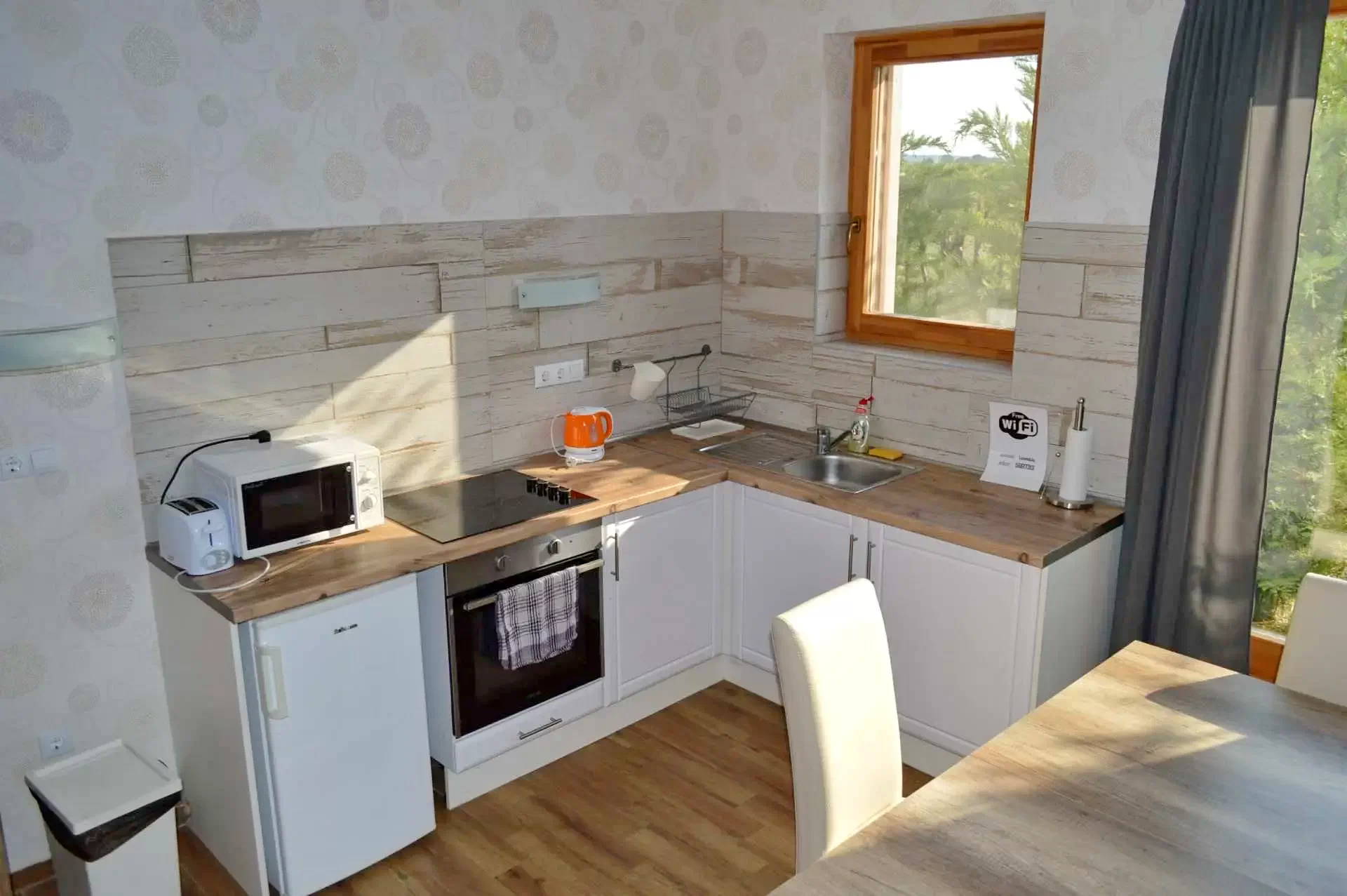 Modern, elegáns, kényelmes, fehér bútorokkal berendezett apartman. A 6 fő befogadására alkalmas vendégházban 2 db 2 ágyas szoba található és a nappaliban egy 2 személyes kanapé. A házban zuhanyzós fürdőszoba és WC, valamint egy közös társalgó és konyha található.